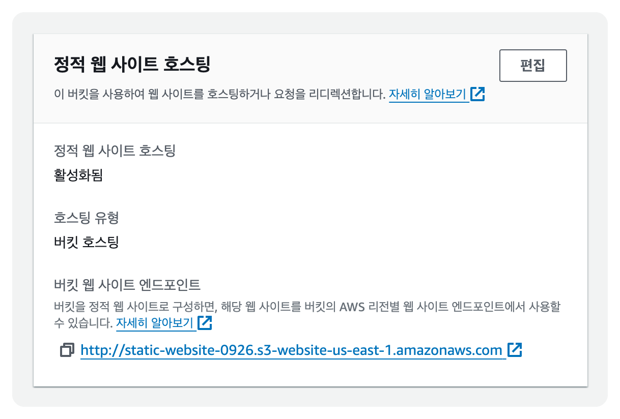 여기까지 완료하면 버킷의 웹 사이트 엔드포인트가 생성된다.
