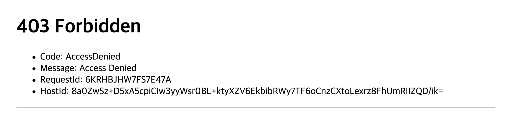 이는 버킷 권한을 아직 구성하지 않기 때문에 생기는 403 Forbidden 메시지로, 나중에 해결할 수 있으니 이 창은 열어둔 상태로 유지하자.